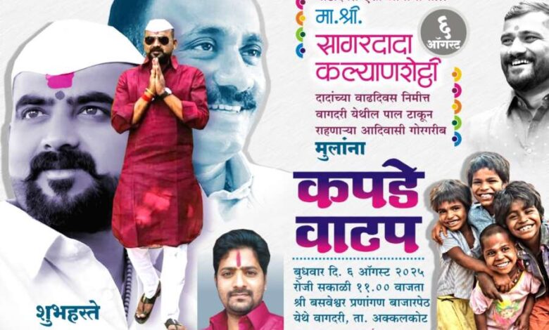 सामाजिक बांधिलकी जपत आपल्या वाढदिवसानिमित्त माजी. श्री. सागरदादा कल्याणशेट्टी यांच्या पुढाकाराने एक आगळावेगळा उपक्रम राबविण्यात येत आहे. दि. ६ ऑगस्ट २०२५ रोजी सकाळी ११.०० वाजता वागदरी येथील बसस्थानक परिसरातील बाजारपेठ येथे गरजू आदिवासी व गोरगरीब मुलांसाठी “कपडे वाटप” कार्यक्रमाचे आयोजन करण्यात आले आहे.