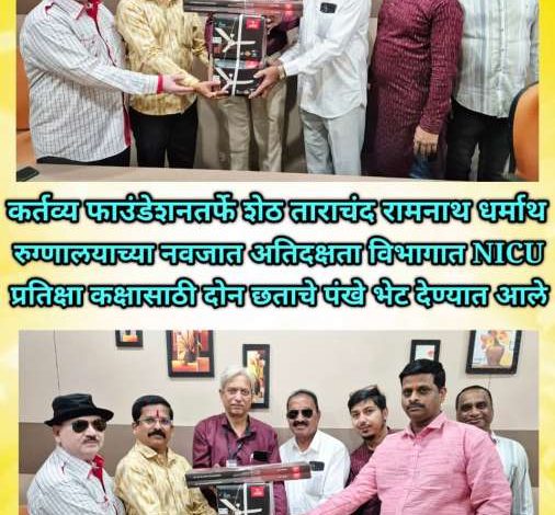 कर्तव्य फाउंडेशनचा उपक्रम : शेठ ताराचंद रामनाथ धर्मार्थ रुग्णालयाच्या NICU विभागाला दोन छताचे पंखे भेट