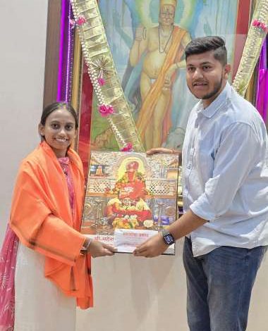 फोटो ओळ – नगराध्यक्ष सिद्धी वस्त्रे यांचा देवस्थान कार्यालयात सत्कार करताना प्रथमेश इंगळे दिसत आहेत.