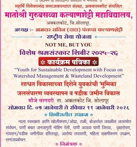 महर्षी विवेकानंद समाजकल्याण संस्था संचलित मातोश्री गुरुबसव्वा कल्याणशेट्टी महाविद्यालयाचे राष्ट्रीय सेवा योजना विभागाचे विशेष श्रमसंस्कार शिबिर वागदरी येथे सोमवार दिनांक 5 जानेवारी ते रविवार दिनांक 11 जानेवारी पर्यंत होणार आहे.