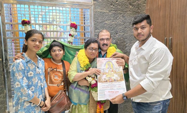 फोटो ओळ – अभिनेते मकरंद अनासपूरे व कुटूंबियांचे श्री स्वामी समर्थांचे कृपावस्त्र, प्रसाद, प्रतिमा देवून सत्कार करताना प्रथमेश इंगळे दिसत आहेत.
