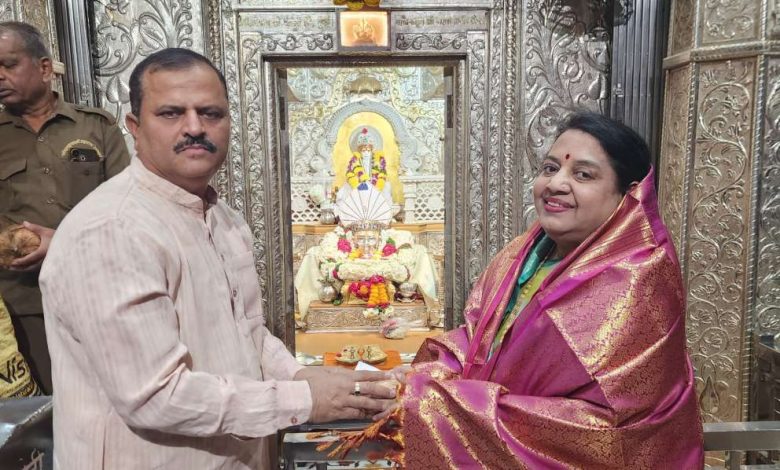 फोटो ओळ – उपनेत्या अस्मिताताई गायकवाड यांचा देवस्थान मध्ये सत्कार करताना महेश इंगळे, प्रथमेश इंगळे, व्यंकटेश पुजारी, श्रीपाद सरदेशमुख व अन्य दिसत आहेत.