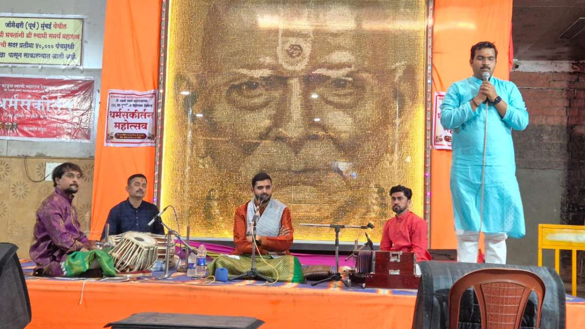 फोटो ओळ – धर्मसंकीर्तन सोहळ्यात व्यासपीठावर अभंगरंग सेवा सादरीकरण प्रसंगी अभिषेक काळे व सहकलाकार दिसत आहेत.