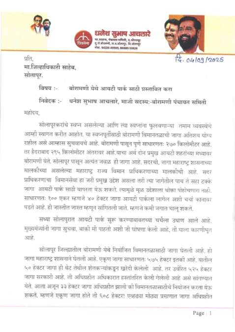 सोलापूरकरांचे स्वप्न असलेल्या आयटी पार्कच्या उभारणीसाठी बोरामणी विमानतळ परिसर सर्वात योग्य ठरेल असा ठाम प्रस्ताव माजी पंचायत समिती सदस्य धनेश सुभाष आचलारे यांनी जिल्हाधिकारी सोलापूर यांच्याकडे सादर केला आहे.
